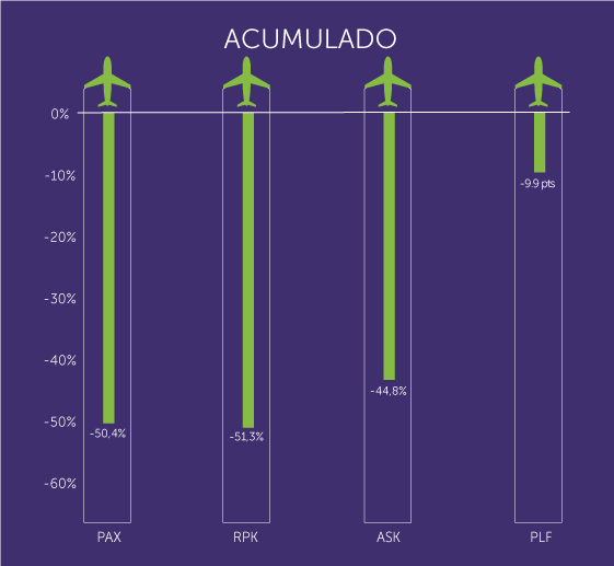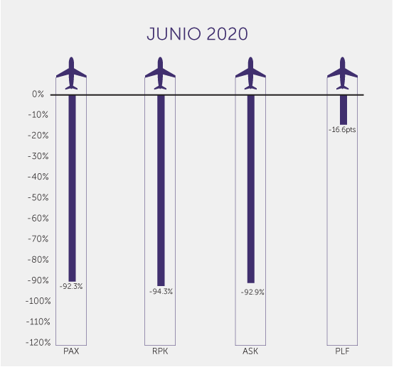 A pesar de que el tráfico decreció más de 90% respecto a junio de 2019, este mes mostró algunos signos positivos para la industria. En junio viajó un total 2.7 millones de pasajeros, es decir más del doble que el punto más bajo del año que fue abril cuando solo viajaron 1.1 millones de pasajeros. Por otro lado, el factor de ocupación se situó en 65.3%, mayor al 40% registrado en mayo.