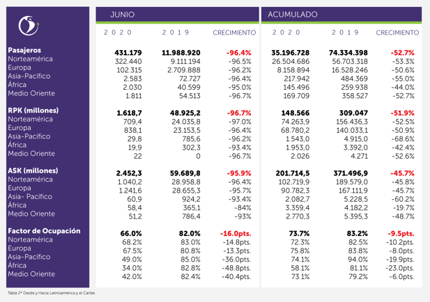 La Asociación Latinoamericana y del Caribe de Transporte Aéreo (ALTA) anunció que las aerolíneas que operan en el mercado de América Latina y el Caribe transportaron 2.7 millones de pasajeros en junio, un 92.3% menos, o -32.324.328 menos pasajeros, que el año anterior. El tráfico (RPK) disminuyó 94.3% y la capacidad (ASK) disminuyó 92.9%, llevando el factor de ocupación a 65.3%, 16.6 puntos porcentuales menos que en 2019 (ver tabla 1).