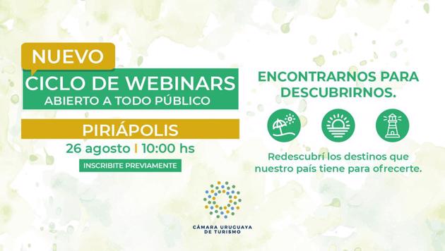Este miércoles 26 a las 10:00 horas se realizará un nuevo Webinar de la Camtur (Cámara Uruguaya de Turismo) en el marco del ciclo #EncontrarnosParaDescubrirnos. En esta ocasión la propuesta es descubrir qué lugares visitar en el espectacular balneario de Piriápolis.