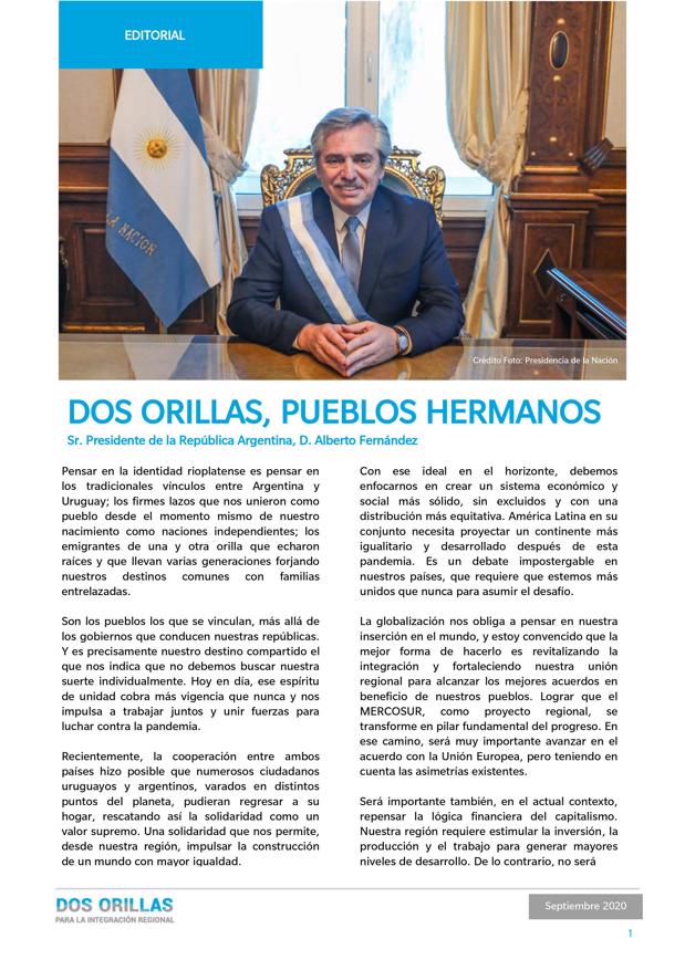 Dentro del ejemplar de setiembre del newsletter "Dos Orillas" de la Embajada de la República Argentina ante el gobierno de la República Oriental del Uruguay, figura el Editorial preparado por el Presidente argentino Alberto Fernández, que publicamos a continuación.