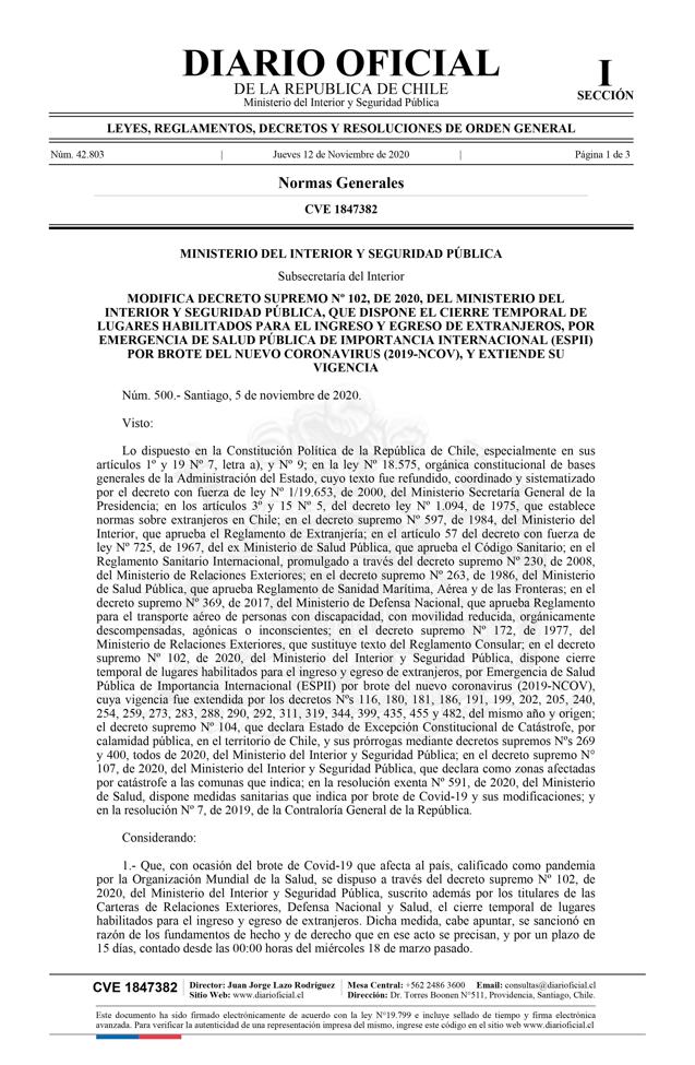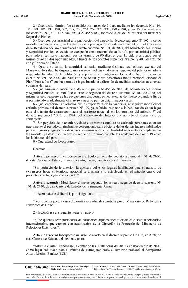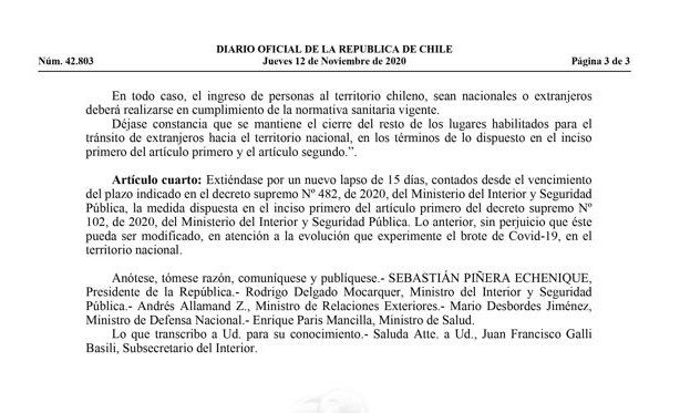 Los otros puntos de acceso al territorio chileno (terrestres, marítimos u otros aeropuertos del país) se mantendrán cerrados, menos quienes porten visas diplomáticas, oficiales o sean funcionarios internacionales, los que podrán ingresar por cualquier paso habilitado para estos efectos