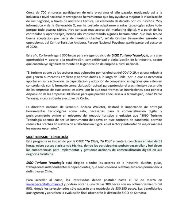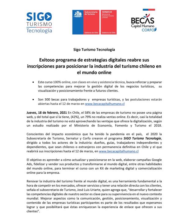 Exitoso programa de estrategias digitales reabre las inscripciones para posicionar al turismo chileno en el mundo online. En 2018, cuando se realizó el primer programa de capacitacion digital, el 58%,de las empresas relacionadas con el turismo no tenían página web, y del 42% restante, el 79% no comercializaban sus productos por Internet.