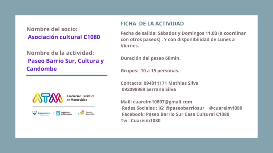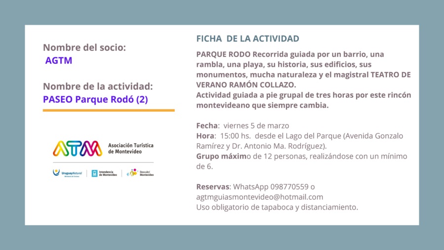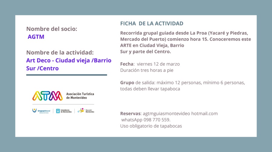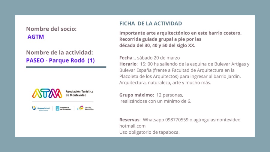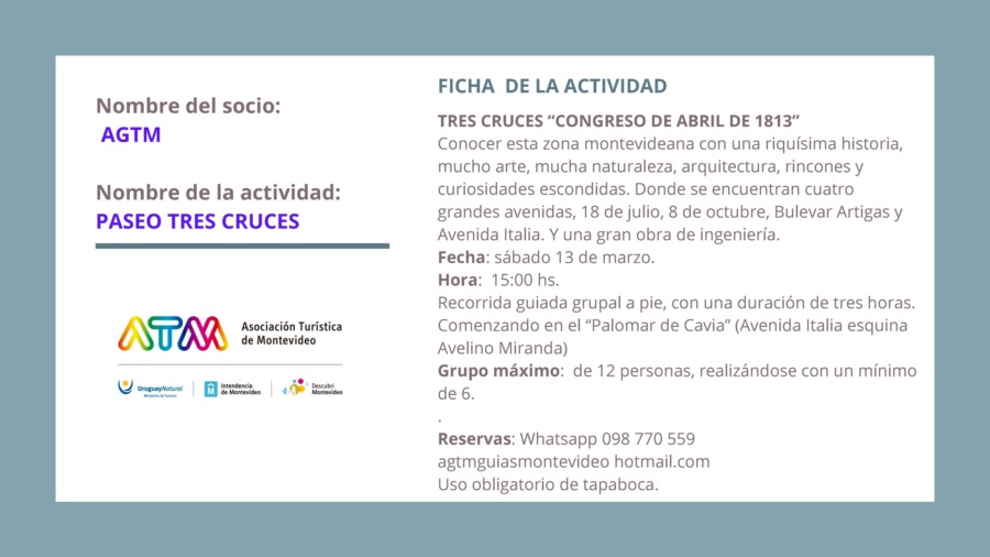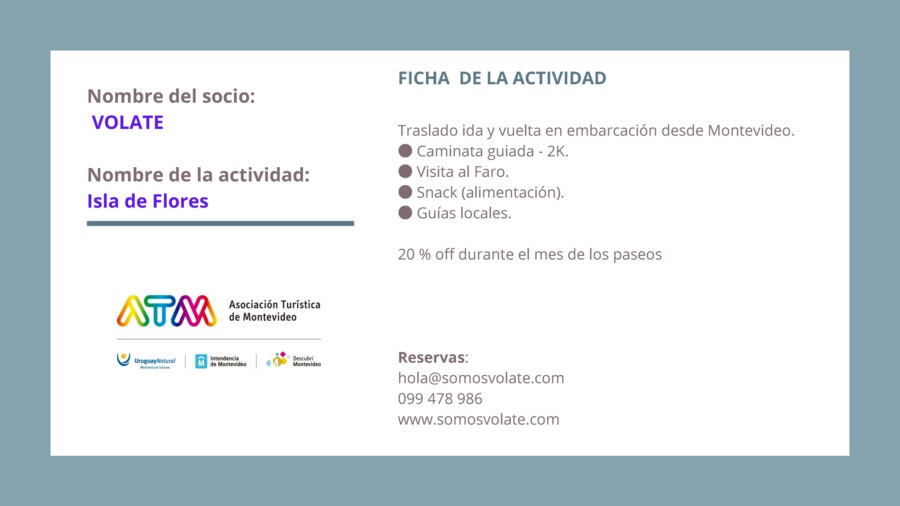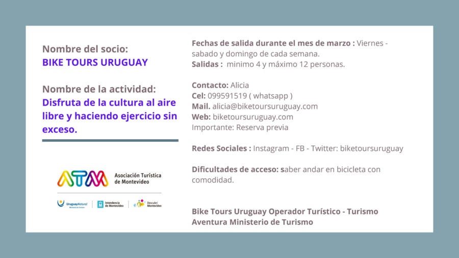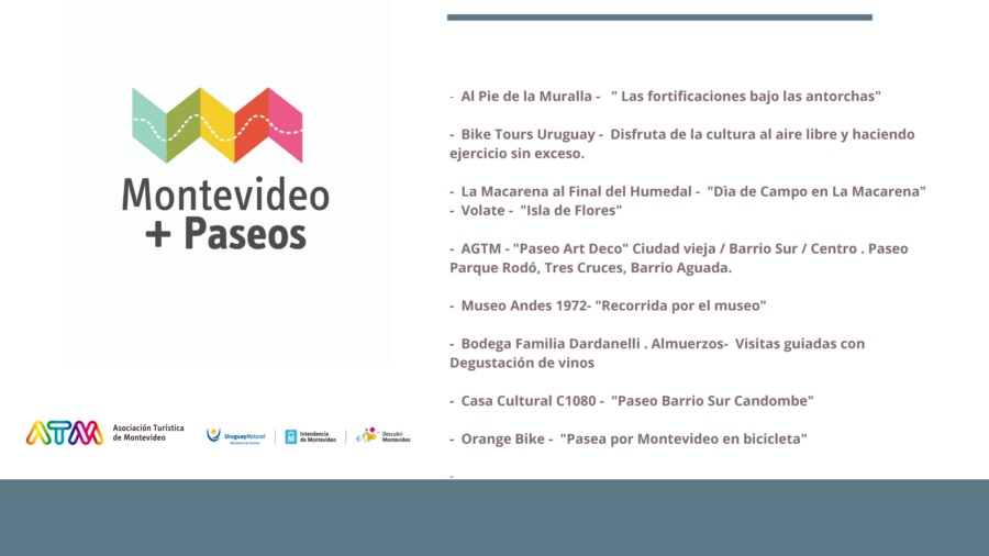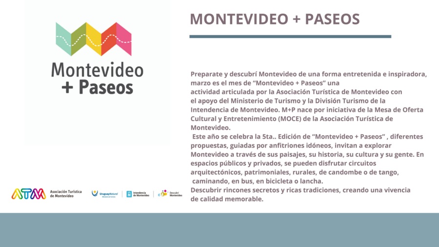 “Montevideo + Paseos” tiene varias propuestas guiadas que invitan a explorar la ciudad a través de sus paisajes, su historia, su cultura y su gente, pudiéndose disfrutar circuitos arquitectónicos, patrimoniales, rurales, de candombe o de tango, caminando, en bus, en bicicleta o lancha, descubriendo rincones secretos y ricas tradiciones, y creando así una vivencia memorable.