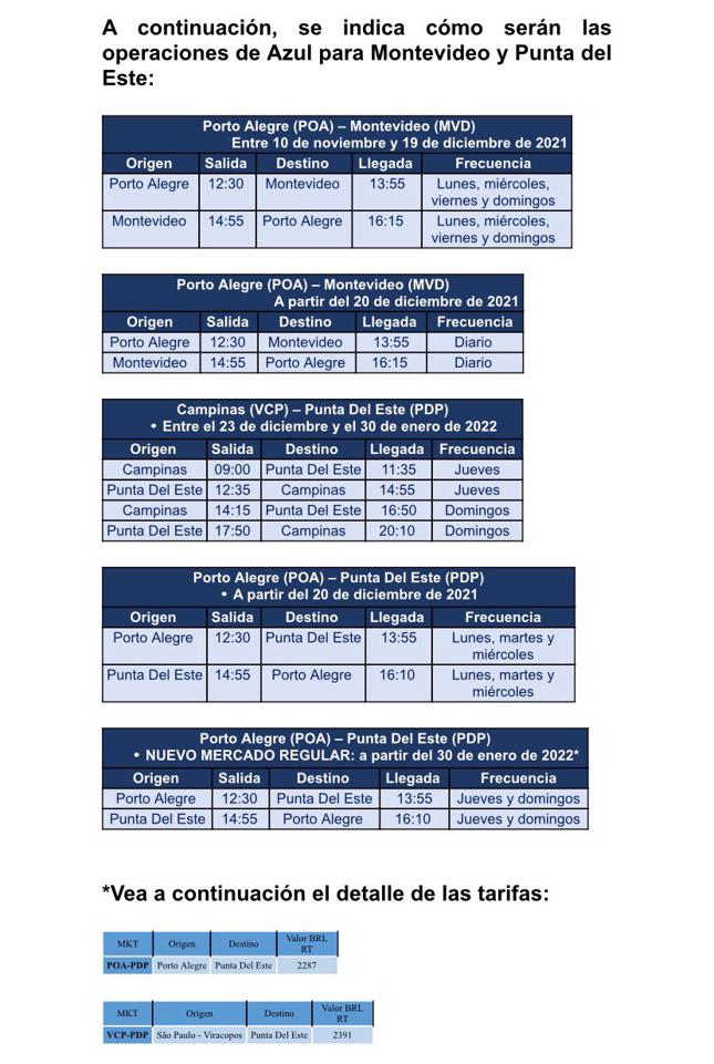 Las frecuencias a Montevideo comenzarán a operar cuatro veces por semana, llegando a un vuelo diario durante la alta temporada. Punta del Este tendrá conexión semanal con Porto Alegre y con Campinas (São Paulo), el mayor centro de conexiones de Azul en Brasil.