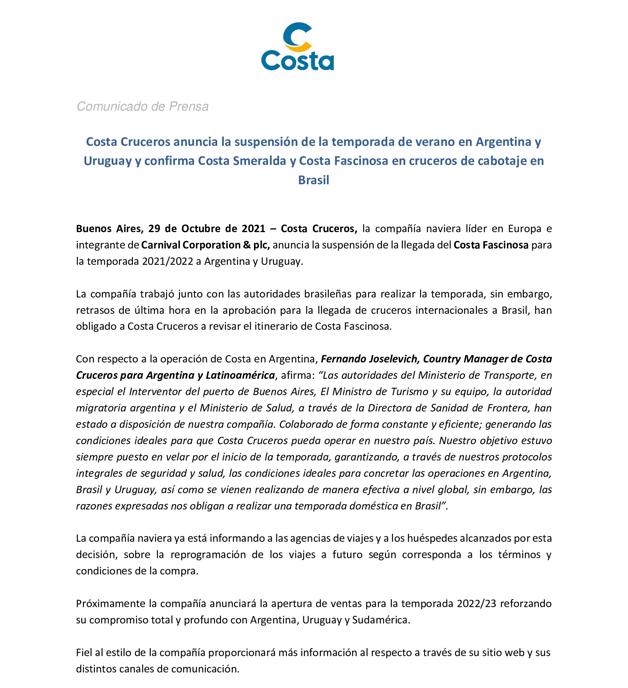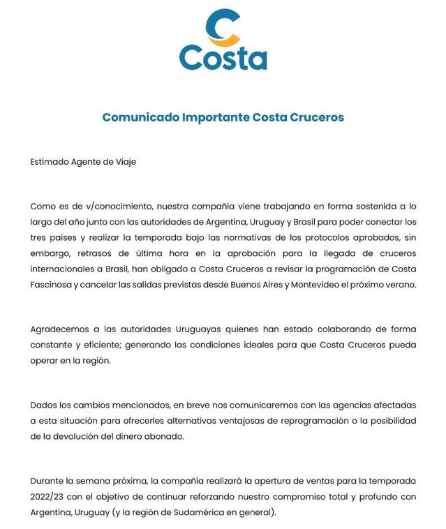 Finalmente los gobiernos de Argentina y Uruguay no pudieron lograr que Brasil cambiase la decisión de sólo autorizar el desembarque de cruceristas que sólo hubiesen transitado por aguas brasileñas. Esta decisión ya había provocado que MSC Cruceros suspendiesen su temporada 2021/2022, porque no permitía los trayectos entre puertos brasileños y puertos rioplatenses. Ahora, al sumarse a la decisión la empresa Costa Cruceros, el Río de la Plata se quedó sin otra temporada. No así Brasil, que sólo tendrá viajes de cabotaje.
