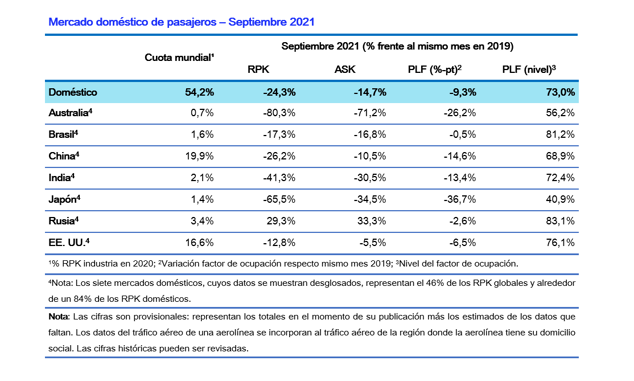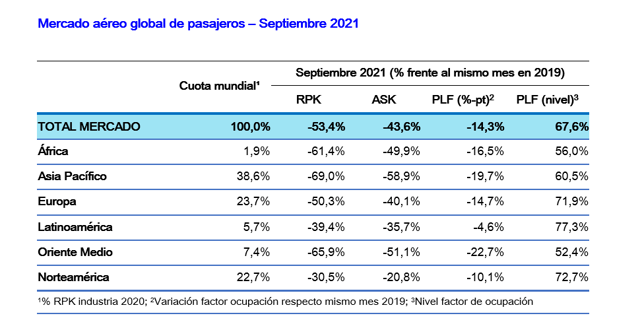 La demanda global de setiembre de 2021, medida en pasajeros-kilómetro transportados (RPK, por sus siglas en inglés), descendió un 53,4% frente a setiembre de 2019. El dato mejora respecto a agosto (-56,0% frente a agosto de 2019).
