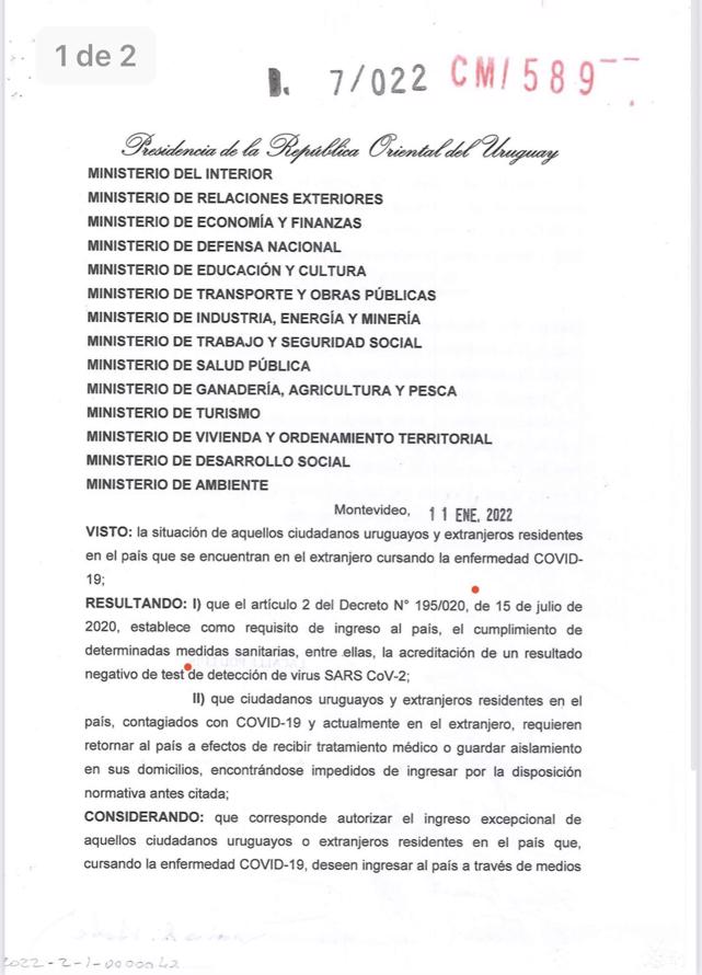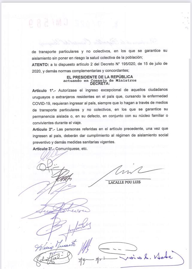 El gobierno uruguayo emitió un decreto por el cual queda habilitado el ingreso de uruguayos o extranjeros residentes con COVID-19. Dicho ingreso será a través de un corredor sanitario y empleando su vehículo particular. Llegados a su domicilio deberán permanecer en aislamiento preventivo.