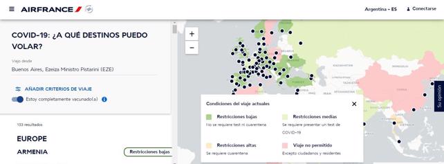 Para comenzar a planificar un viaje, los clientes pueden consultar los mapas de Air France y KLM y completar el aeropuerto o el país y el origen. Luego, los pasajeros pueden explorar el mapa interactivo para ver los requisitos de viaje más actualizados para los destinos de cada aerolínea.