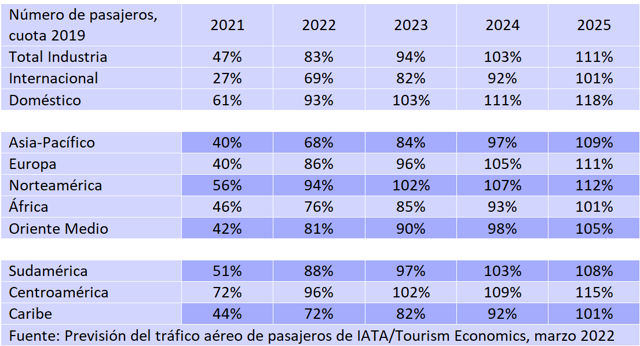 Latinoamérica: el tráfico hacia/desde/dentro de Latinoamérica ha sido relativamente resistente durante la pandemia y se pronostica un 2022 fuerte, con restricciones de viaje limitadas y flujos de pasajeros dinámicos dentro de la región y hacia/desde Norteamérica. Se prevé que las cifras de pasajeros de 2019 se superen en 2023 en América Central (102%), seguida de América del Sur en 2024 (103%) y el Caribe en 2025 (101%).