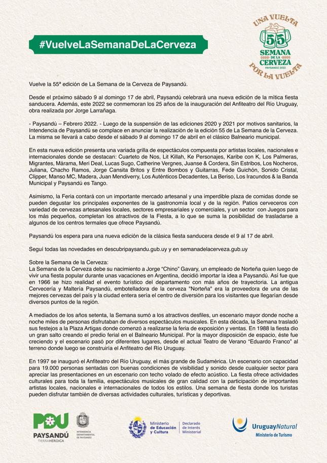 Argimón por su parte, aseguró que en esta 55ª Semana de la Cerveza "vale la vuelta, vale el reencuentro". Agregó que Paysandú "está lleno de maravillas" y destacó especialmente el impulso al tango que viene dándole la administración liderada por Nicolás Olivera. "Será la semana del reencuentro", destacó.