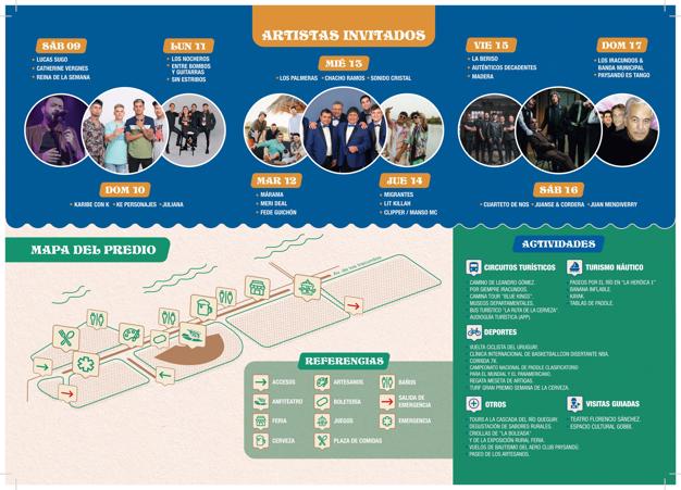 El viernes 15 actuarán Madera, Los Auténticos Decadentes y La Beriso; en tanto que el sábado 16 será el turno de Juan Mendiverry, Juanse & Cordera, cerrando la noche el Cuarteto de Nos. El domingo 17 estarán en el Anfiteatro Los Iracundos, La Banda Municipal y se presentará Paysandú es Tango.