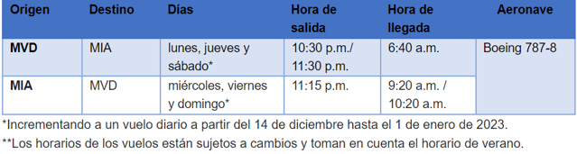 El servicio entre MVD y MIA será operado por aviones Boeing 787-8 Dreamliner de 234 asientos en la ruta con 20 cápsulas de clase ejecutiva, 28 sillones reclinables económicos premium, 48 asientos de clase económica con espacio extra para las piernas y 138 de clase económica estándar, ofreciendo a los clientes una experiencia de vuelo de clase mundial con cabinas Flagship® Business y Premium Economy, así como interiores de última generación, transmisión de TV en vivo, Wi-Fi de alta velocidad y cientos de películas y programas de TV disponibles en cada asiento.
