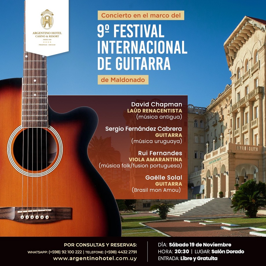 Sábado 19/11 - Hora 20:30 - Concierto en el marco del 9º Festival Internacional de Guitarra de Maldonado - David Chapman Laúd renacentista (música antigua) Sergio Fernández Cabrera - Guitarra (música uruguaya) Rui Fernandes - Viola amarantina (música folk/fusion portuguesa) Gaëlle Solal - Guitarra (Brasil mon Amou ).