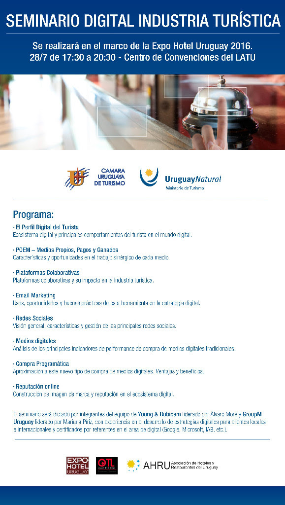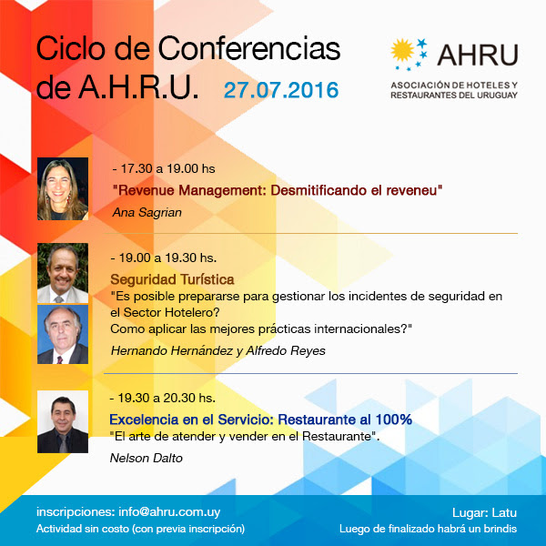 El 27 de julio en el marco de la Expo Hotel Uruguay 2016 que se realizará en el Centro de Convenciones del LATU, se realizarán tres conferencias a partir de las 17:30 horas. Al día siguiente será el turno de un Seminario Digital. Estas actividades son sin costo y requieren sólo de su inscripción en el momento. El calendario es el que sigue.