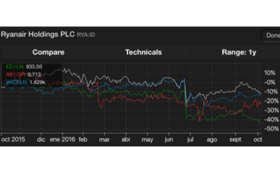 Las compañías de bajo coste no han sido inmunes a las turbulencias y al pesimismo de los inversores, tal y como se puede comprobar en el segundo gráfico.