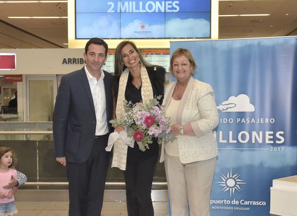 La pasajera que completó los dos millones fue recibida con una singular bienvenida por la ministra de Turismo, Liliam Kechichián, y por Diego Arrosa, CEO de Corporación América en Uruguay, grupo al cual pertenece Puerta del Sur, concesionaria del Aeropuerto de Carrasco.