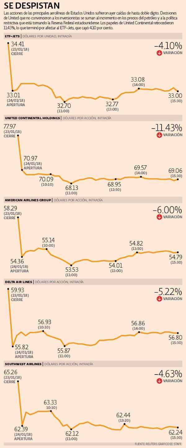United Continental fue la más presionada; vio reducir su capitalización (precio de las acciones por el número de títulos en circulación) en 2,643 millones de dólares, después de ver caer sus títulos 11.43%, a 69.06 dólares.