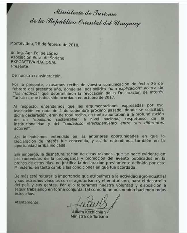Como ya lo expresamos en el artículo editorial El permanente espíritu de venganza de los jerarcas oficiales del turismo uruguayo el Ministerio de Turismo decidió retirar la declaración de interés nacional que había dado a la Expoactiva Nacional, que se realizará entre el miércoles 7 y el sábado 10 en Mercedes, organizada por la Asociación Rural de Soriano. Ante ese hecho, los presididos por el Ingeniero Agrónomo Felipe López, le solicitaron a la secretaría de Estado conocer las razones que llevaron a esta medida. La respuesta de la ministra de Turismo no menciona la verdadera causa, o sea, la participación en el evento del movimiento Un sólo Uruguay, creado por los productores autoconvocados que organizaran el multitudinario acto del 23 de enero pasado en Durazno. Compartimos la carta enviada por el Mintur a la Asociación Rural de Soriano.