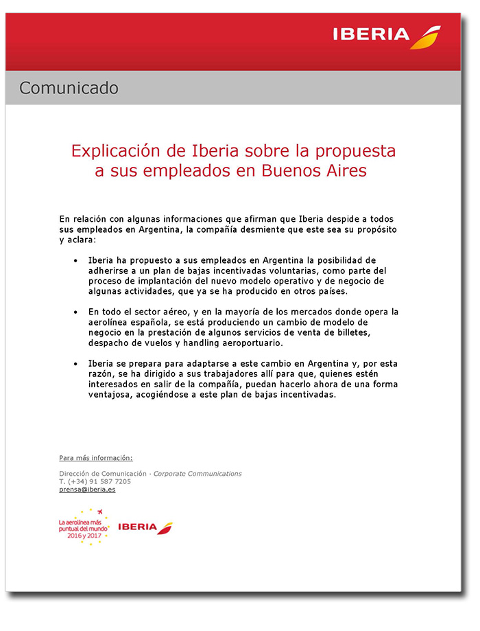 "Estimado Antonio, espero que estés bien. He visto que os hacéis eco del informe de APA sobre el plan de bajas incentivadas que hemos ofrecido a nuestro personal en Argentina: Te paso un comunicado-aclaración porque la intención de Iberia no es, como se ha dicho, despedir a todo su personal.Es evidente que vamos hacia un nuevo modelo de negocio –que ya se ha producido en todos los mercados y en muchos servicios-, pero es algo progresivo y este plan de bajas incentivadas pretende que quien tenga intención de dejar la compañía voluntariamente, lo pueda hacer en las mejores condiciones posibles.Te agradezco si, por favor, podéis incluir también nuestra versión en vuestras informaciones.Recibe un cordial saludo, LauraTirado Martínez-Comunicación Externa · Dirección de Comunicación". Tal el texto que precede al comunicado que compartimos a continuación.