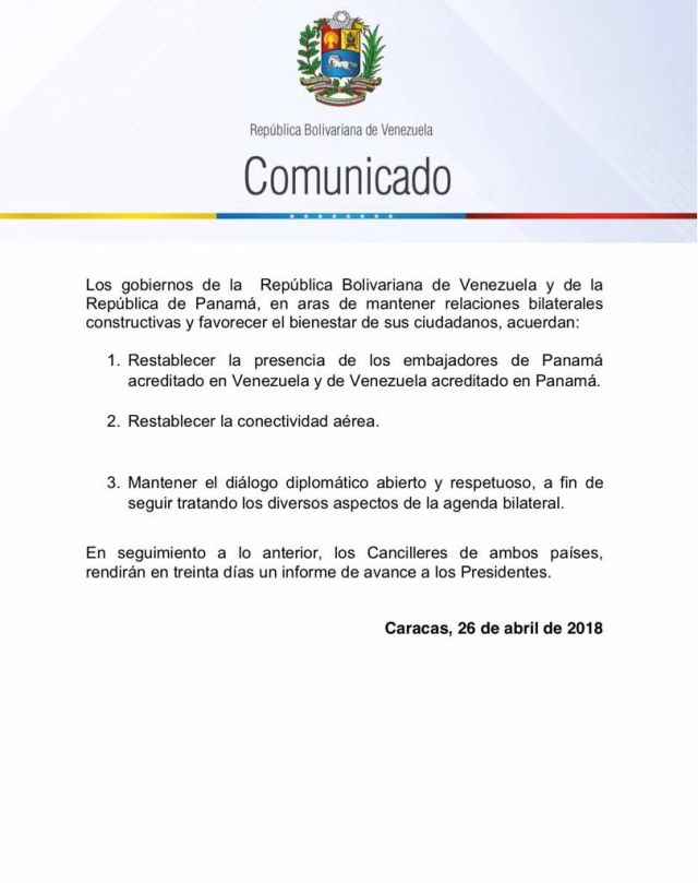Tras conversaciones directas entre los Presidentes @NicolasMaduro y @JC_Varela , Venezuela y Panamá acuerdan el retorno de sus embajadores, el restablecimiento de la interconexión aérea y mantener el diálogo diplomático entre sus cancilleres para los temas pendientes. Comunicado: