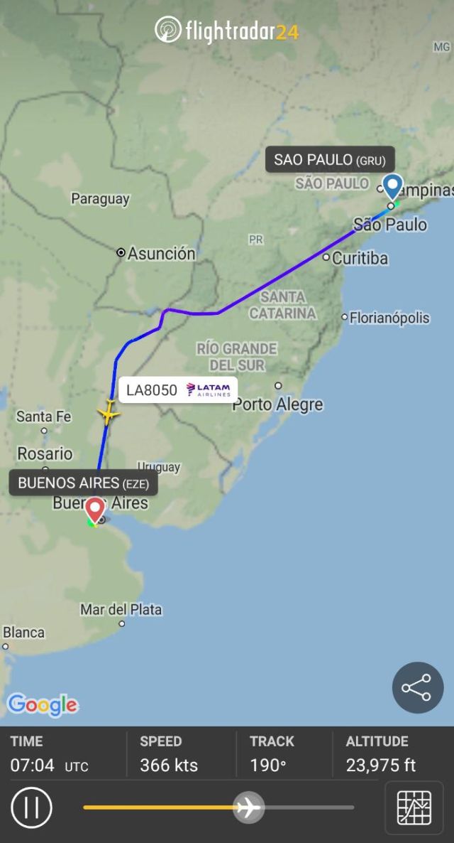 Según los registros del vuelo LA 8050, cayó 1.500 metros en apenas un minuto y medio y su velocidad se disparó a más de mil kilómetros por hora cuando pasaba por encima de la ciudad de Posadas. Debido a los daños sufridos, la aeronave tuvo que cambiar de rumbo y fue directo a Ezeiza, según se puede ver en el sitio Flight Radar.