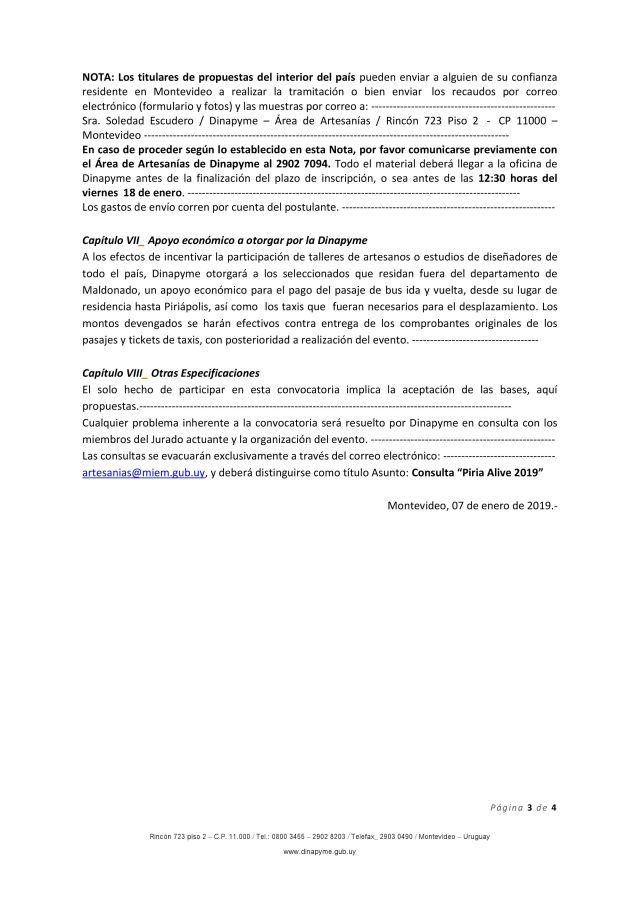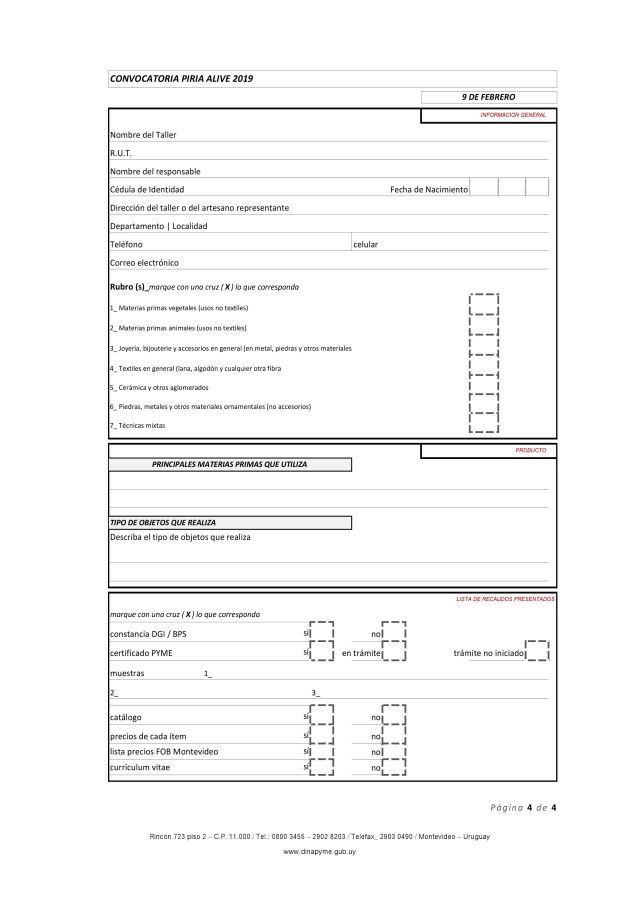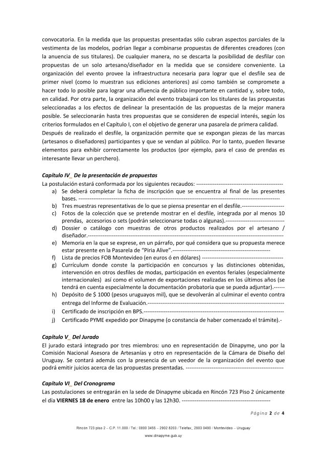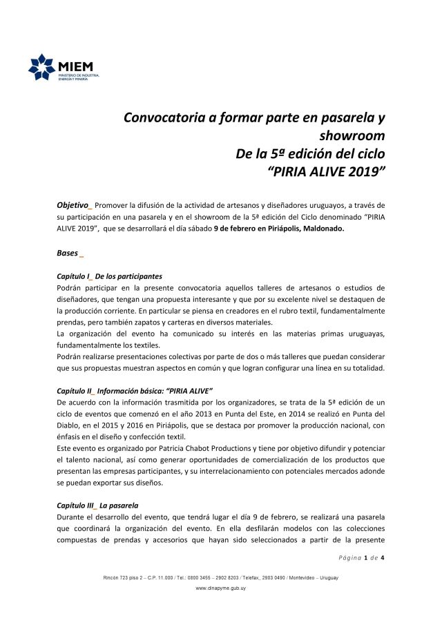 Patricia Chabot Producciones y DINAPYME-MIEM convocan a artesanos y diseñadores uruguayos a formar parte de la pasarela y show room de la 5ª edición del ciclo "PIRIA ALIVE 2019" que se desarrollará el sábado 9 de febrero en el emblemático Castillo Piria, de Piriápolis. Las postulaciones se entregarán en la sede de Dinapyme ubicada en Rincón 723 Piso 2 únicamente el día VIERNES 18 de enero entre las 10h00 y las 12h30. A continuación el llamado, bases y formulario.