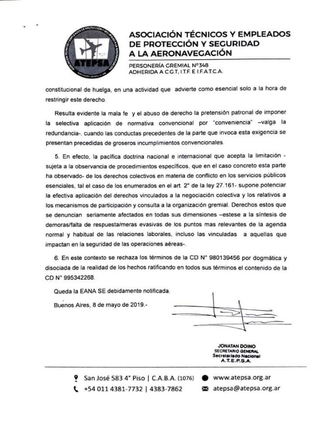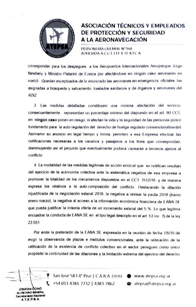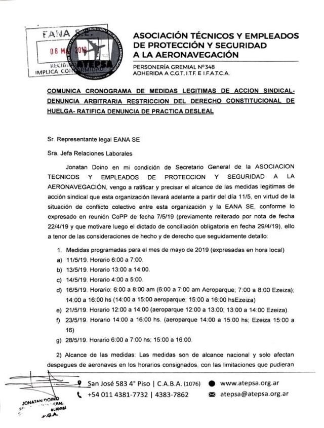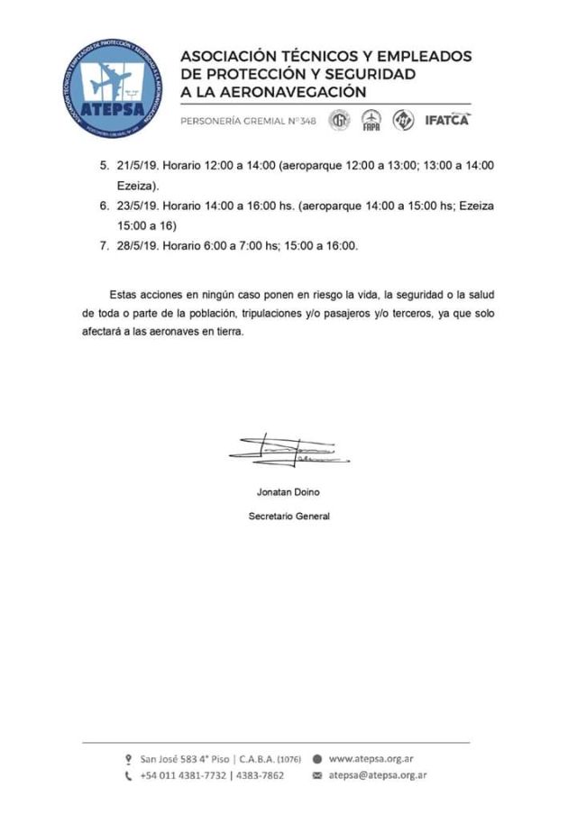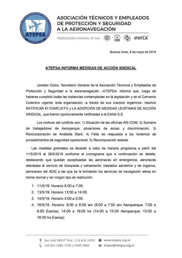 A continuación el Comunicado emitido por ATEPSA detallando fechas y horarios de afectación de los servicios a la aeronavegación, y por considerarlo de interés, la nota dirigida a la autoridad aeronáutica donde se comunican las medidas y las razones por las cuales se llegó a esta decisión.