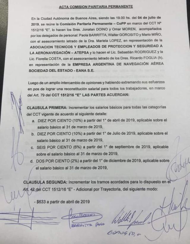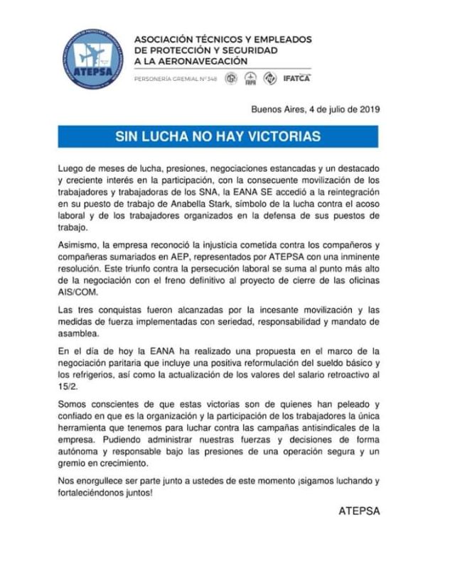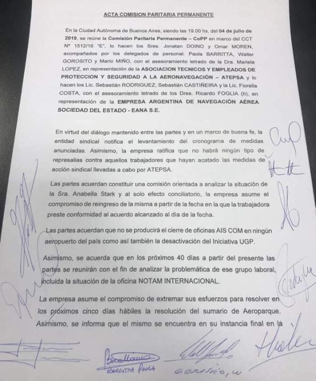 Este jueves la Asociación de Técnicos y Empleados de Protección y Seguridad a la Aeronavegación (ATEPSA) de la República Argentina firmó un preacuerdo con las autoridades que incluye cláusulas contemplativas de todos los puntos que reivindicaba. Por lo tanto, quedaron sin efecto las medidas de no despegue que habían anunciado el lunes.