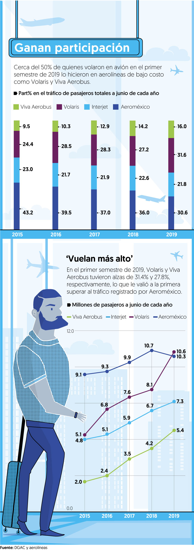De los 33 millones 620 mil 142 viajeros movilizados por las empresas aéreas mexicanas en el periodo enero-junio, Volaris, dirigida por Enrique Beltranena y Viva Aerobus, presidida por Juan Carlos Zuazua, transportaron en total 16 millones 6 mil 878 pasajeros, con lo que ambas compañías le restaron protagonismo a Interjet y Aeroméxico.
