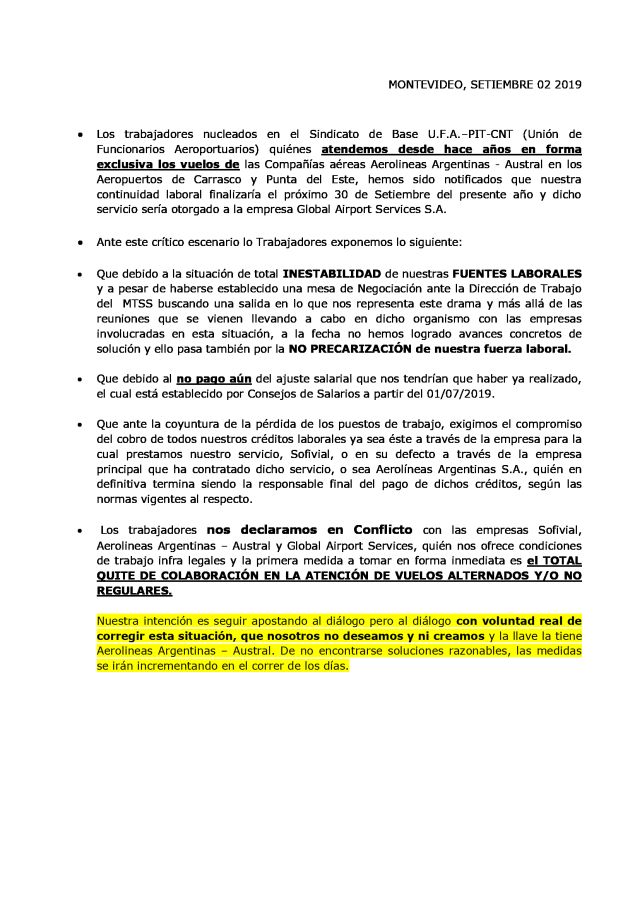 Desde que el pasado 29 de julio publicamos "Aerolíneas Argentinas cambia servicio de tierra en Uruguay", hemos dado en sucesivas notas participación a todos los involucrados en el conflicto que parecía se desataría. Finalmente hoy recibimos en nuestra mesa de trabajo el Comunicado de la Unión de Funcionarios Aeroportuarios que publicamos a continuación, que señala como primer medida "...el TOTAL QUITE DE COLABORACIÓN EN LA ATENCIÓN DE VUELOS ALTERNADOS Y/O NO REGULARES.