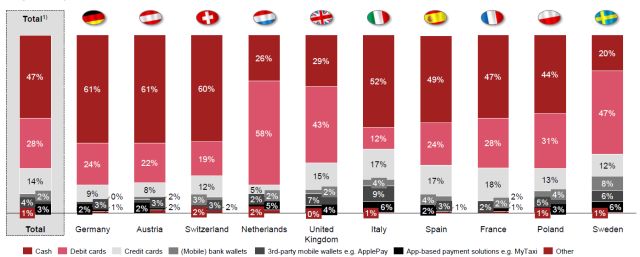 Según el estudio, el 47% de los consumidores europeos prefiere el uso del dinero en efectivo, a la hora de hacer sus pagos, antes que cualquier otro método electrónico. Este porcentaje es especialmente elevado en Alemania (61%), Austria (61%), y Suiza (60%).