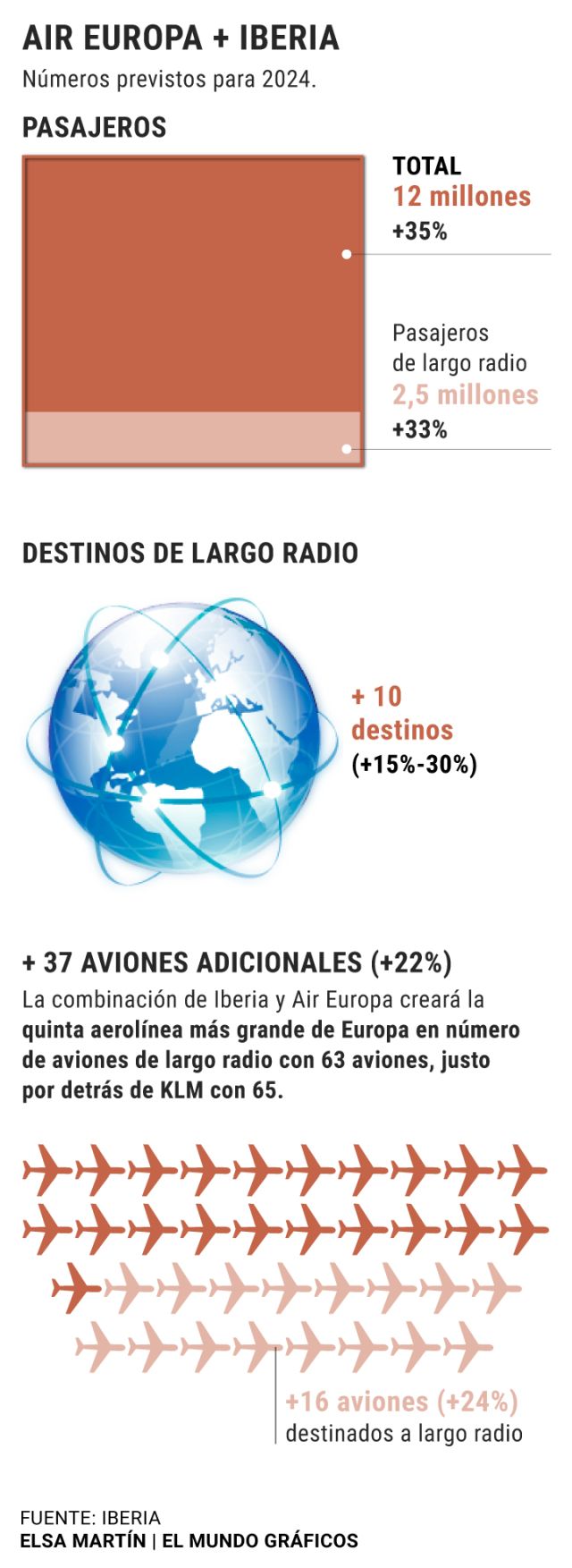 La incorporación de Air Europa a IAG permitirá generar más tráfico y por lo tanto más destinos y más aviones. En concreto, para 2024, ambas pueden sumar hasta 12 millones pasajeros más, 10 destinos adicionales de largo radio y 37 aviones adicionales a la flota, de los cuales 16 se dedicarían al largo radio.