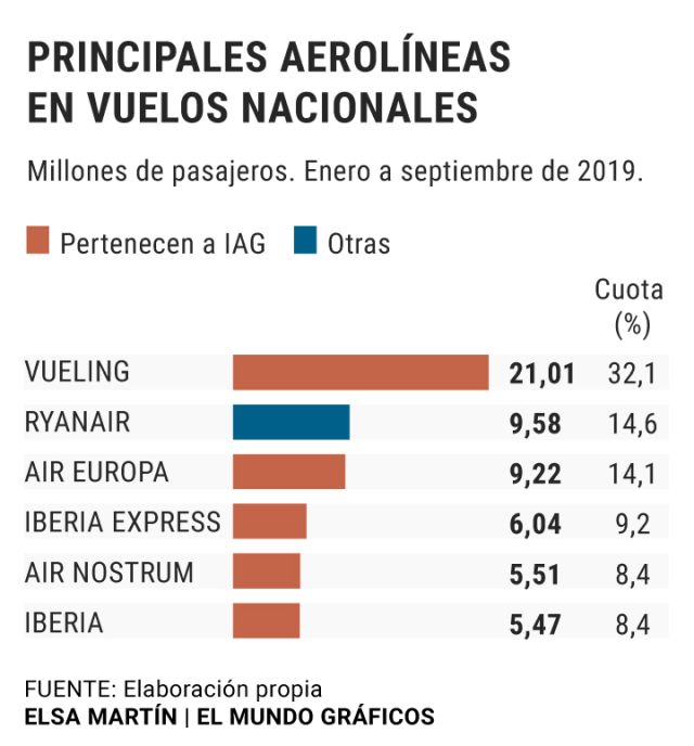 Con esta compra, IAG pasa a controlar cuatro de las seis primeras aerolíneas por número de pasajeros en vuelos nacionales en nuestro país (Vueling, Air Europa, Iberia y Iberia Express). Hasta ahora, Ryanair era la aerolínea que más pasajeros movía en España, contando también los vuelos internacionales. Ahora, con la compra, Grupo Iberia (que integra Iberia, Iberia Express y Air Nostrum) la desplaza en el podio .