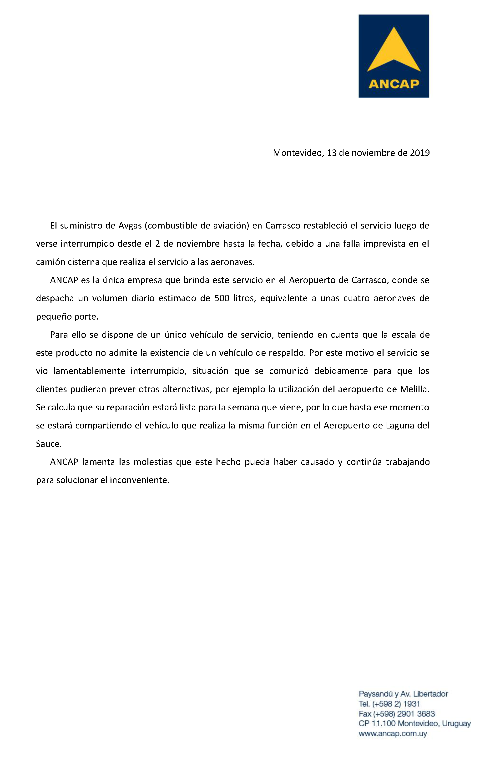 En la mañana del pasado miércoles 13 recibimos en nuestra mesa de trabajo la información. El sábado 2 de noviembre, ANCAP -aduciendo la rotura del camión cisterna que cumple regularmente el servicio-, había informado vía comunicado que hasta el día 9 no habría suministro de combustible para la aviación general (taxis aéreos, aviones privados, etc.). El día 9, un nuevo comunicado informaba que la medida se extendía "hasta nuevo aviso". De inmediato nos comunicamos con la presidencia de la petrolera, solicitando entrevistar periodísticamente a la presidente, la Ingeniera Marta Jara. Desde la secretaría se nos informó que la jerarca estaba muy ocupada y que solicitaba enviáramos las preguntas por correo electrónico. Así lo hicimos antes de mediodía. Al caer la tarde, recibmos la respuesta, la compartimos.