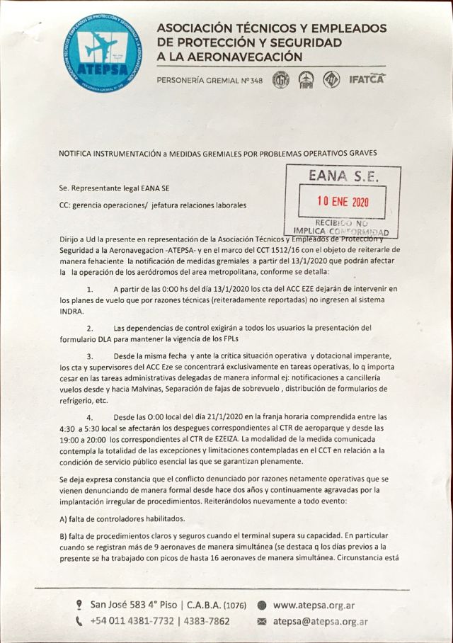 ATEPSA (Asociación Técnicos y Empleados de Protección y Seguridad a la Aeronavegación de la República Argentina) notifica adopción de medidas de acción gremial a partir del 13/1/2020, las cuales podrían afectar la operatoria de los aeródromos del Área Metropolitana Buenos Aires. Publicamos el Comunicado.