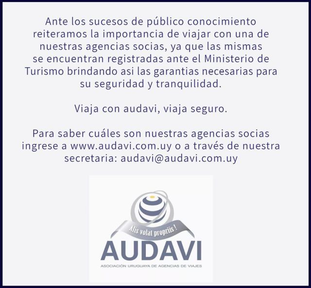 Nuevamente un grupo de personas se vieron estafadas y perdieron el dinero que habían pagado para realizar un viaje. Confiaron en una "Agencia de Viajes" que sólo figuraba en Facebook. No tenía ni dirección fija, ni estaba registrada ante el Ministerio de Turismo. En este tipo de situaciones, la pérdida es total. En el caso de que la Agencia de Viajes sea real y cumpla con todos los requisitos, una vez completados los trámites legales y administrativos, el viajero frustrado podrá recuperar parcial o totalmente lo abonado. Tal es el caso de la quiebra de "Uruguay Viajes" en 2018, que los damnificados están cobrando. Publicamos el siguiente comunicado de AUDAVI, la Asociación Uruguaya de Agencias de Viajes, dejando a la vez, la correspondiente constancia que también existen agencias debidamente registradas en el Mintur, que no están afiliadas a ninguna asociación gremial.