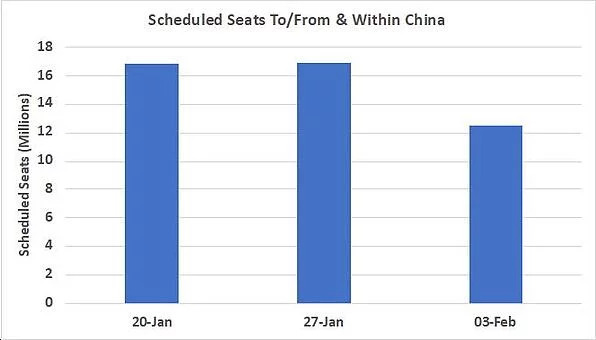 Capacidad doméstica eliminada: naturalmente, gran parte de la cobertura de la prensa mundial se ha centrado en el impacto en los servicios aéreos internacionales. Sin embargo, tal vez la historia real sea alrededor de una reducción de 3.8 millones en la capacidad de los servicios domésticos chinos, se han programado unos 23,000 menos servicios domésticos que la semana pasada. En términos de escala, vale la pena señalar que el mercado interno chino es aproximadamente 43 veces más grande que el mercado internacional más grande.