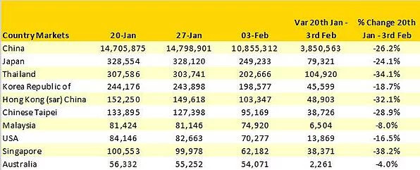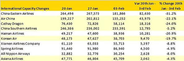 Más de 25,000 vuelos cancelados. Habrá más de 25,000 vuelos menos operados hacia / desde y dentro de China esta semana en comparación con hace dos semanas, como lo muestra el cuadro a continuación. La capacidad internacional ha caído en 586.000 con treinta líneas aéreas que abandonan los servicios a China, incluidas las líneas aéreas como Lion Air, Lufthansa y Turkish Airlines, que caen más de 8.000 asientos semana a semana.