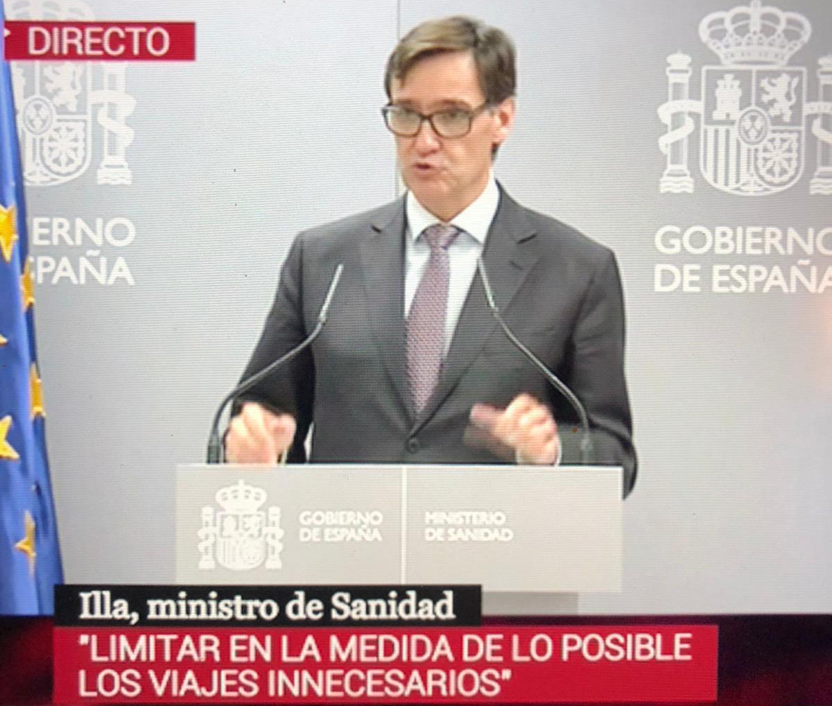 En dos conferencias de prensa paralelas trasmitidas por la televisión oficial y todas las cadenas privadas anunciaron el Ministro de Salud Salvador Illa y la Presidenta de la Comunidad de Madrid medidas extraordinarias de suspension de las clases en todos los niveles, tratar de recurrir al teletrabajo mientras sea posible, evitar los viajes y no salir de sus casas los ancianos y personas con enfermedades crónicas. Otras de las medidas a tomar: partidos de futbol a puerta cerrada