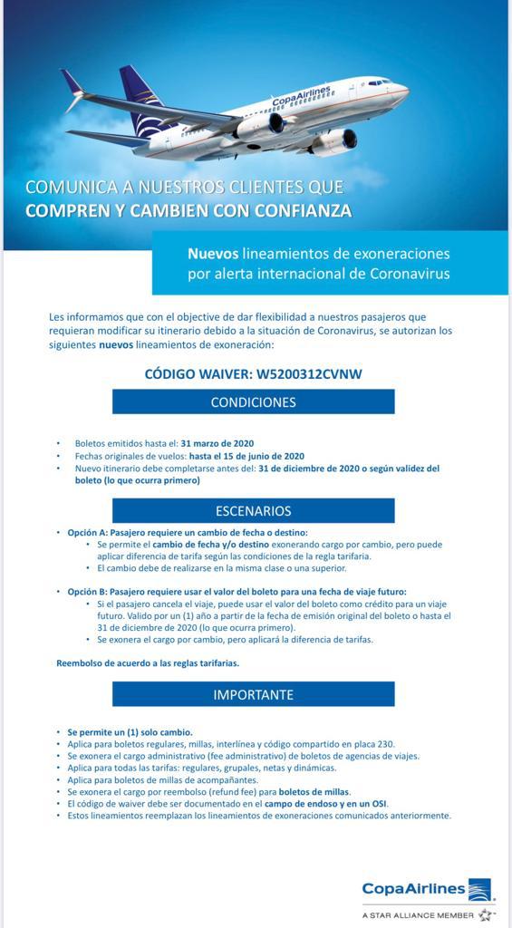 Compartimos los nuevos lineamientos de exoneraciones por alerta internacional de Coronavirus emitidos por COPA Airlines en esta jornada