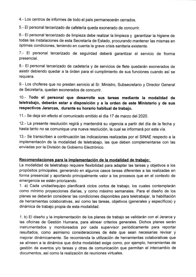 Con la finalidad de extremar las medidas de prevención contra la propagación del virus COVID-19, el MINTUR ha implementado la modalidad de teletrabajo en todas aquellas oficinas cuyos servicios no deban ser necesariamente prestados en forma personal.