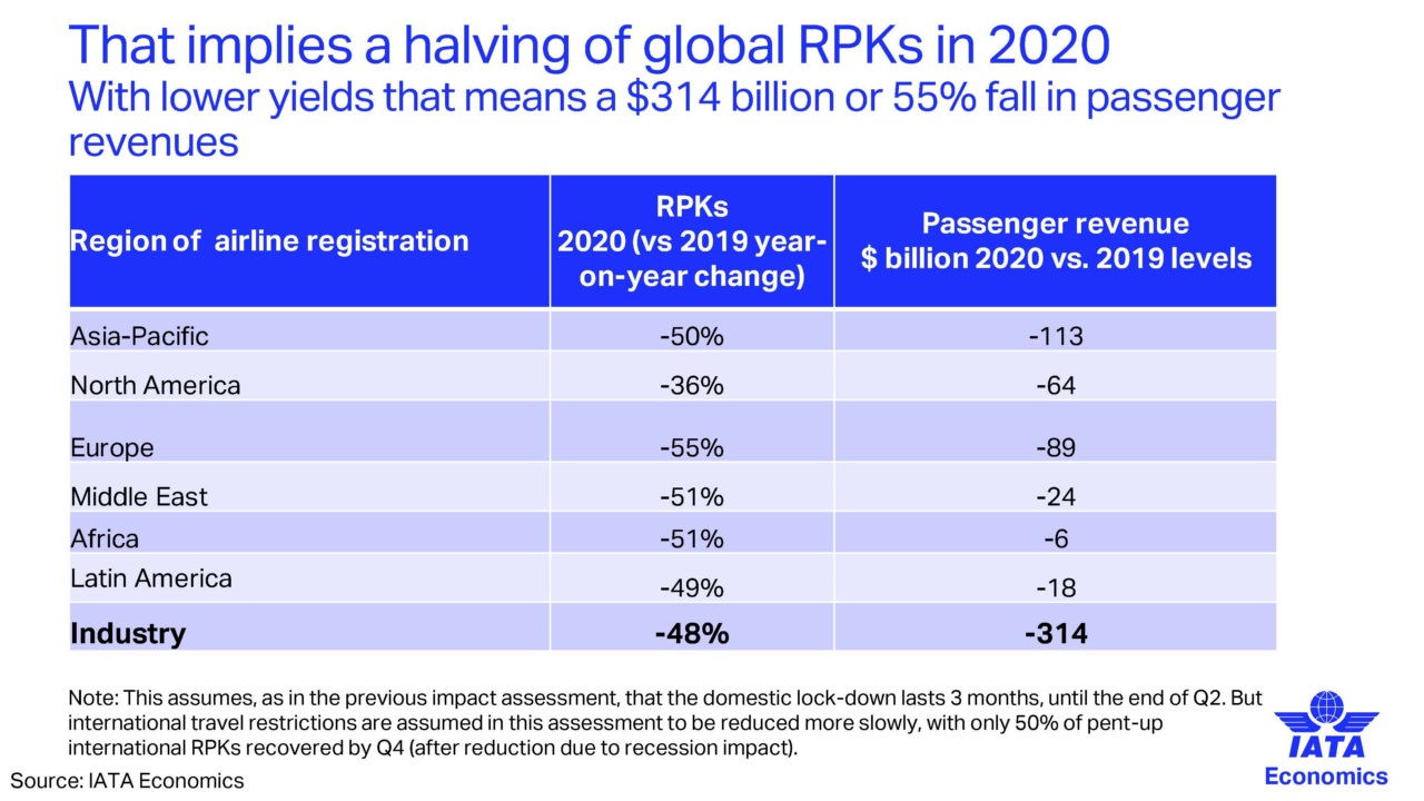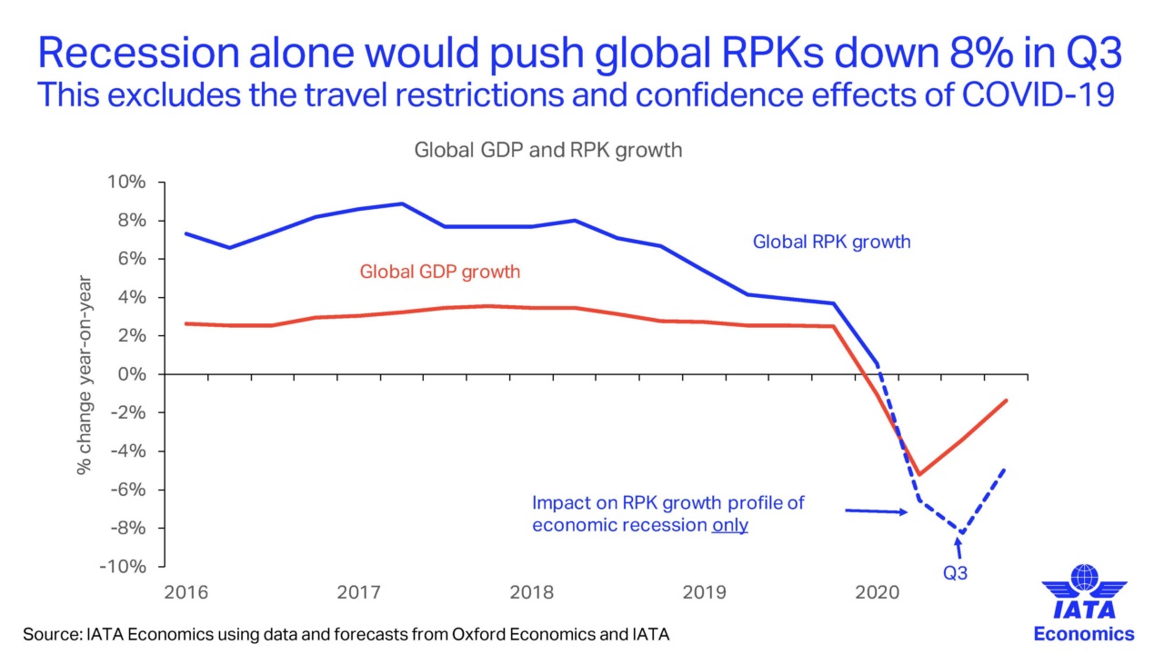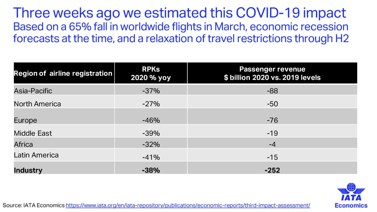 IATA analiza en detalle cuanto está afectando la pandemia del COVID-19 tanto en cantidad de operaciones (80% menos hasta comienzos de este mes) como en la consecuente caída abrupta de los RPK (Revenue Passenger/kilometers, un indicador de desempeño clave en la industria aeronáutica) proyectándose una disminución de casi el 50% (mundial) respecto a 2019. Esto significa una baja del ingreso del 55% cercana a los 314 mil millones de dólares con su correspondiente impacto en el PBI mundial. Pero sin detenerse allí, realiza una proyección de la actividad para lo que resta del 2020 y una comparación con otras crisis vividas en los últimos 10 años, observando que la actual arrojará resultados sin precedentes, aún peores a los registrados en la crisis del 2008. Pero no todo son malas noticias. Su previsión de un punto de inflexión a partir del 4to trimestre del año en curso, nos muestra una luz al final del túnel, aunque no todas las compañías aéreas logren superar esta crisis tan imprevista como devastadora