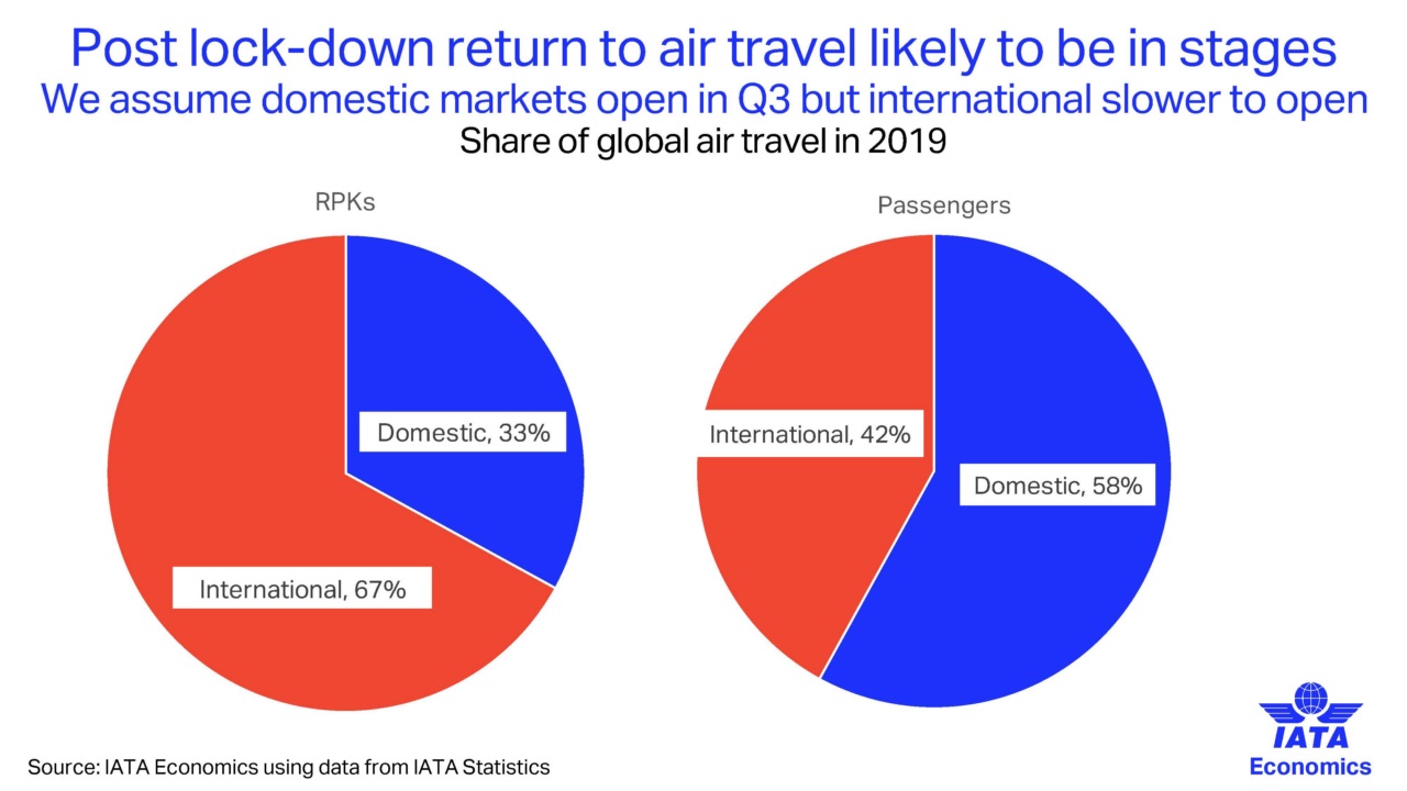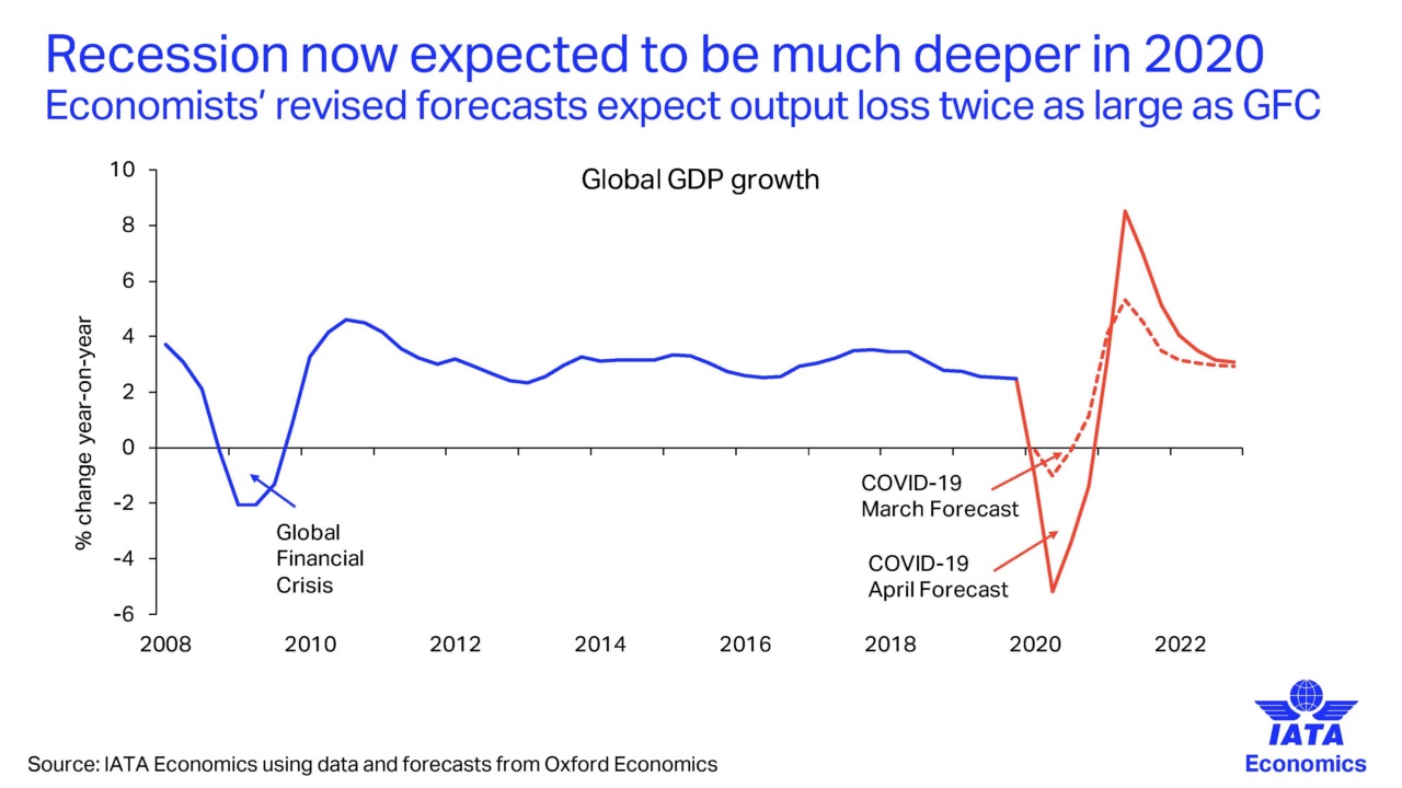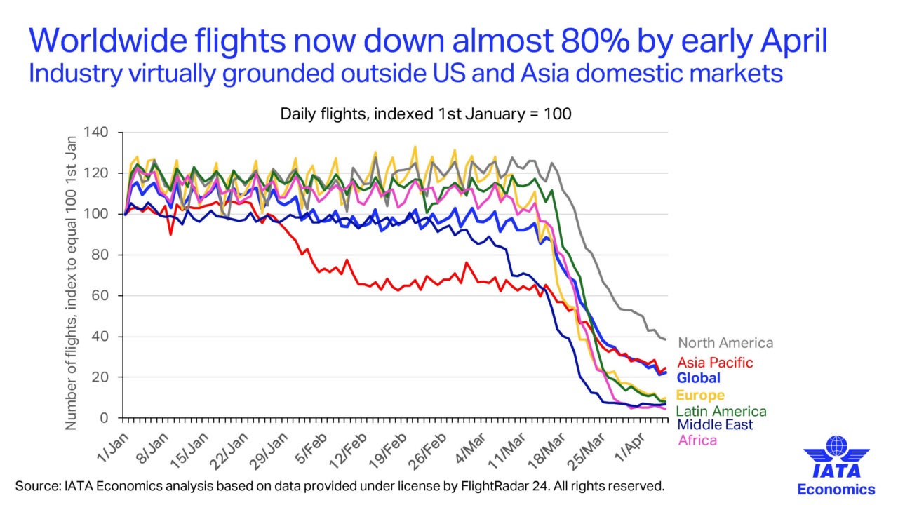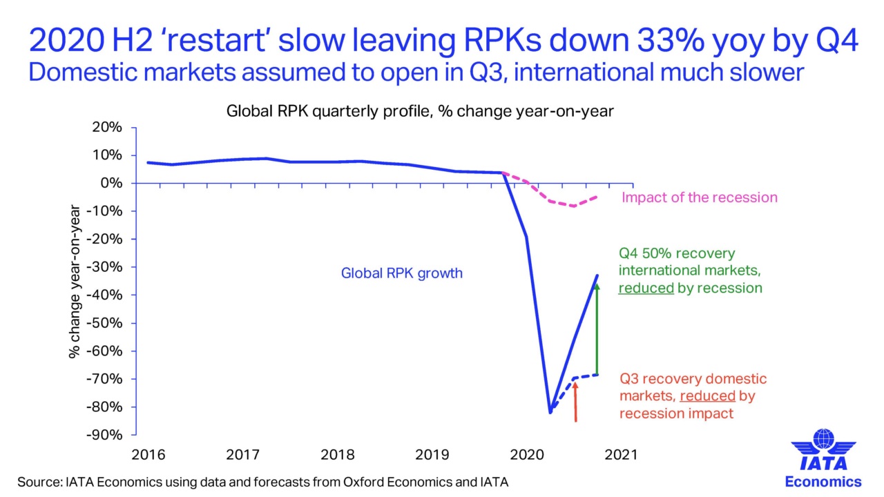 IATA analiza en detalle cuanto está afectando la pandemia del COVID-19 tanto en cantidad de operaciones (80% menos hasta comienzos de este mes) como en la consecuente caída abrupta de los RPK (Revenue Passenger/kilometers, un indicador de desempeño clave en la industria aeronáutica) proyectándose una disminución de casi el 50% (mundial) respecto a 2019. Esto significa una baja del ingreso del 55% cercana a los 314 mil millones de dólares con su correspondiente impacto en el PBI mundial. Pero sin detenerse allí, realiza una proyección de la actividad para lo que resta del 2020 y una comparación con otras crisis vividas en los últimos 10 años, observando que la actual arrojará resultados sin precedentes, aún peores a los registrados en la crisis del 2008. Pero no todo son malas noticias. Su previsión de un punto de inflexión a partir del 4to trimestre del año en curso, nos muestra una luz al final del túnel, aunque no todas las compañías aéreas logren superar esta crisis tan imprevista como devastadora