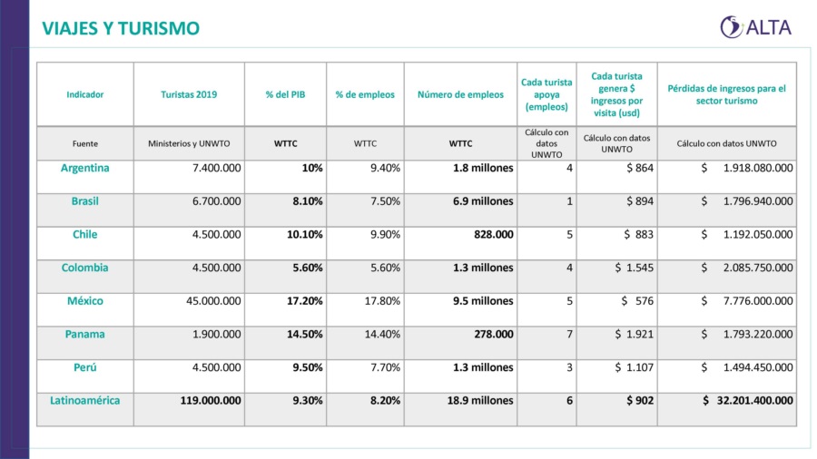 Las pérdidas del turismo latinoamericano es mayor aún. Estimando una pérdida del 30% respecto al año anterior, la cifra superaría los U$S 32 mil millones.