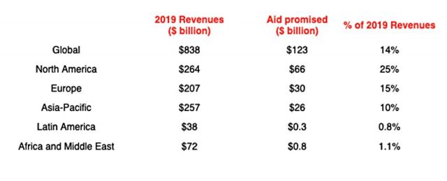 Norteamérica es la región que más aporta con el paquete entregado por el Gobierno del Presidente Donald Trump. Toda esa región considera ayudas por US$67 mil millones que se han distribuido entre distintas compañías de ese país. Le sigue Europa con US$30 mil millones, Asia-Pacífico con US$26 mil millones y África con US$0,8 mil millones.