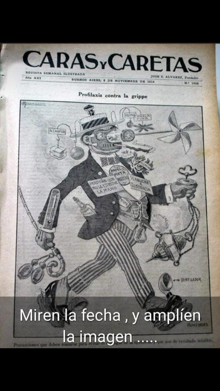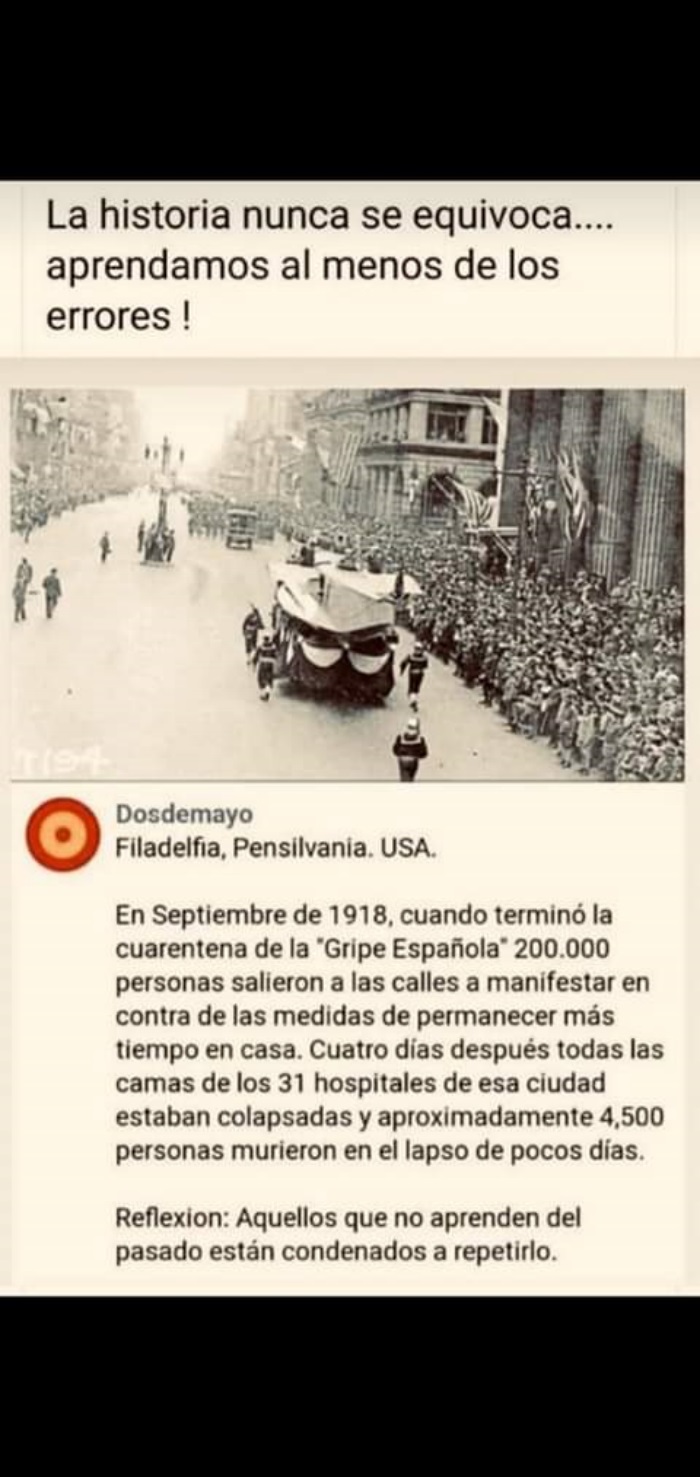 Hay una imagen que dice es en Pensilvania, EEUU, en setiembre de 2018, cuando terminó la cuarentena de la "Gripe Española", diciendo que 200 mil personas salieron a manifestar a las calles en contra de las medidas de permanecer encerrados y que a raíz de ello, colapsaron los hospitales y nurieron miles de personas. EFE lo desmiente y dice que la foto es engañosa: "La imagen sí fue tomada en esa ciudad de Estados Unidos el 28 de septiembre de 1918, pero no retrataba una protesta, sino un desfile organizado por el gobierno para promover la compra de bonos para financiar la guerra. El evento causó el peor brote del virus en esa ciudad". También hay muchas versiones acerca de la siguiente imagen que demostraría sugestivamente que cada cien años hay una pandemia y también se llega a decir que son programadas para reducir la población mundial. Aparece de nuevo EFE: DATOS: Es una mentira sin base histórica, médica ni demográfica: Las fechas citadas son inexactas, corresponden a brotes que en algunos casos no fueron pandémicos y omiten otra pandemias sucedidas entre 1920 y 2020. Además, estos graves episodios de crisis sanitaria no responden al objetivo premeditado de reducir la población, según explican especialistas en Historia de la Medicina consultados por EFE.