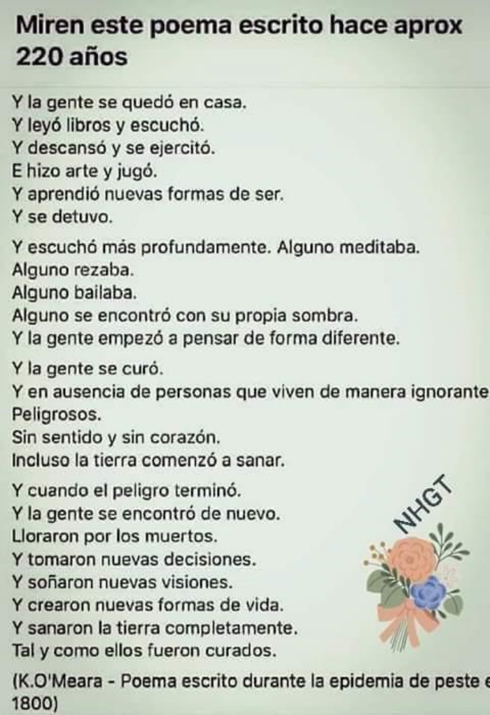 Bajo el título "Miren este poema escrito hace aprox 220 años", bien, tampoco es nada de hace tanto tiempo, leemos en La Vanguardia de Barcelona a Lara Gómez Ruiz que nos cuenta: "Durante estos días de confinamiento, es muy probable que haya llegado a sus teléfonos móviles y a sus correos un poema que empieza así: “Y la gente se quedó en casa. Y leyó libros y escuchó. Y descansó y se ejercitó. E hizo arte y jugó. Y aprendió nuevas formas de ser. Y escuchó más profundamente. Alguno meditaba. Alguno rezaba. Alguno bailaba. Alguno se encontró con su propia sombra. Y la gente empezó a pensar de forma diferente”. Lo firma una misteriosa K. O’Meara y supuestamente data de 1800, el mismo año en el que hubo la gran epidemia de peste. Sin embargo, en las últimas horas se ha sabido que no fue escrito entonces. Su autora es Kitty O’Meara, una antigua maestra y asistente espiritual en hospitales y hospicios de Estados Unidos que se ha inspirado para escribir este texto durante la pandemia actual de coronavirus.