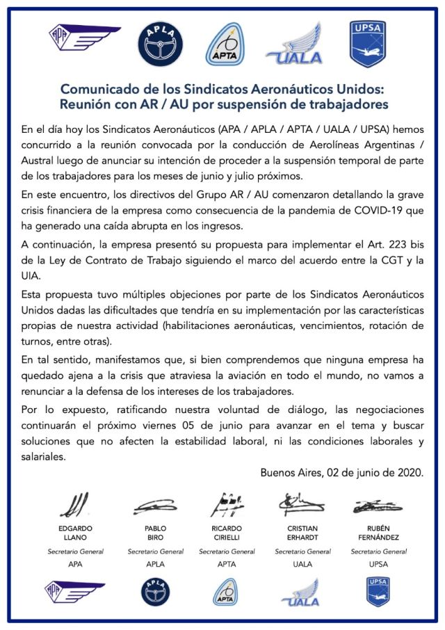 Este martes los sindicatos aeronáuticos argentinos mantuvieron una reunión con directivos del Grupo Aerolíneas Argentinas / Austral debido a la próxima suspensión temporal de parte de los trabajadores del grupo. No hubo acuerdo y se volverán a reunir el viernes. Publicamos el comunicado.