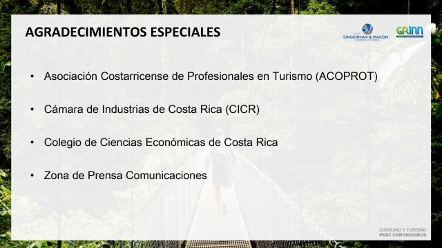 La investigación “Consumo y Turismo Post Coronavirus”, realizado por Grinn Innovations junto a la firma argentina Singerman & Makón, contó con el aporte de la Asociación Costarricense de Profesionales en Turismo (ACOPROT), la Cámara de Industrias de Costa Rica (CICR), el Colegio de Ciencias Económicas de Costa Rica y Zona de Prensa Comunicaciones.