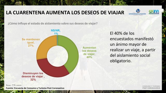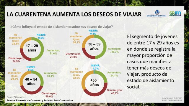 Otro dato relevante que generó la investigación, fue que el 40% de los encuestados manifestó un ánimo mayor de realizar un viaje, a partir del aislamiento social obligatorio. El segmento de jóvenes de entre 17 y 29 años es en donde se registra la mayor proporción de casos que manifiesta tener más deseos de viajar, producto de la cuarentena.
